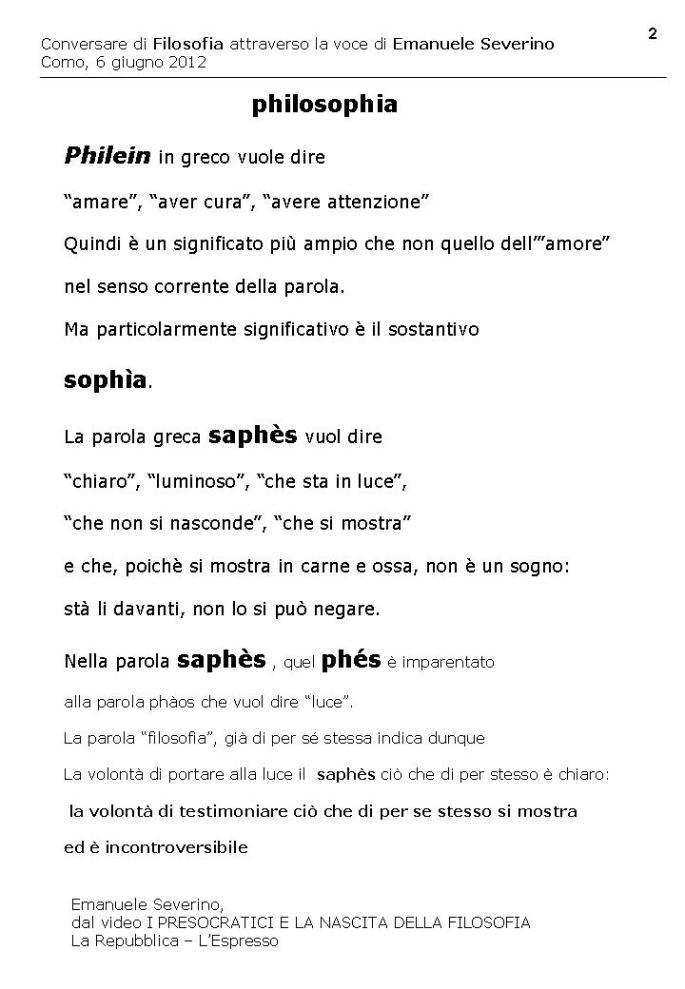 RIPRENDIAMO LA QUESTIONE DEL “COS’È LA FILOSOFIA” (TRATTATA GIÀ NEL PRIMO INCONTRO) ATTRAVERSO IL METODO DELL’ANALISI ETIMOLOGICA CHE È STRUTTURANTE NELLE SCALETTE ARGOMENTATIVE DI SEVERINO: