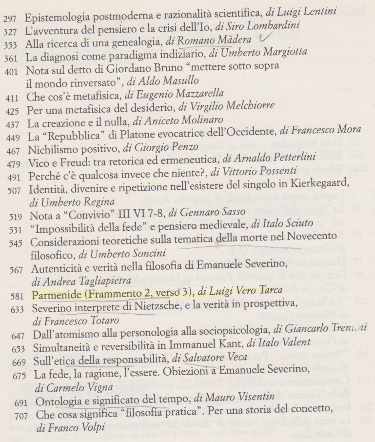 40 pensieri riguardo “Le parole dell’Essere. Per Emanuele Severino, a cura di Arnaldo Petterlini, Giorgio Brianese, Giulio Goggi, Bruno Mondadori, 2005, pagine 718. Indice del libro”