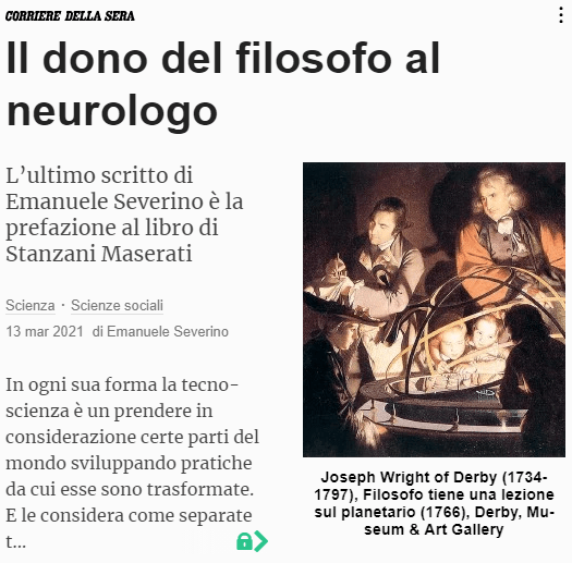 Il dono del filosofo al neurologo, prefazione di EMANUELE SEVERINO al libro: Coscienza e significato, di Michelangelo Stanzani, Scholè’, 2021. In Corriere della Sera 13 marzo 2021