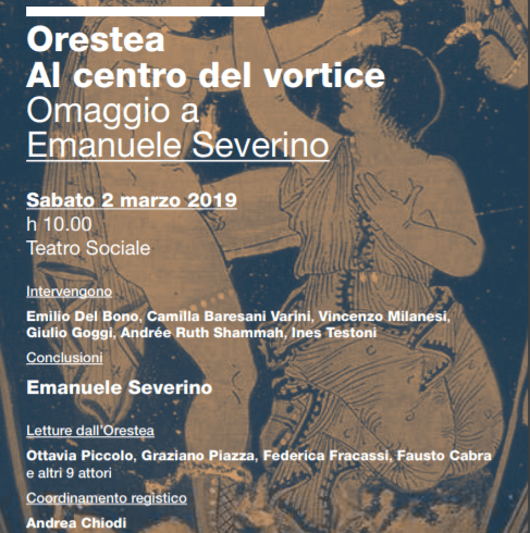 ORESTEA/ AL CENTRO DEL VORTICE. Per i festeggiamenti in onore dei 90 anni di Emanuele Severino l’ASES – Associazione di Studi “Emanuele Severino” e il Centro Teatrale Bresciano organizzano una mattinata di studio e teatro dedicata al filosofo bresciano, sabato 2 marzo 2019 al Teatro Sociale di BRESCIA (L’ingresso è libero con prenotazione del posto a partire dal 5 febbraio: comunicare che siete soci dell’ASES)