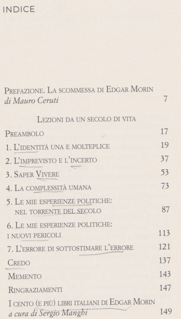 MORIN Edgar, Lezioni da un secolo di vita, prefazione di Mauro Ceruti, Mimesis, 2021. Indice del libro